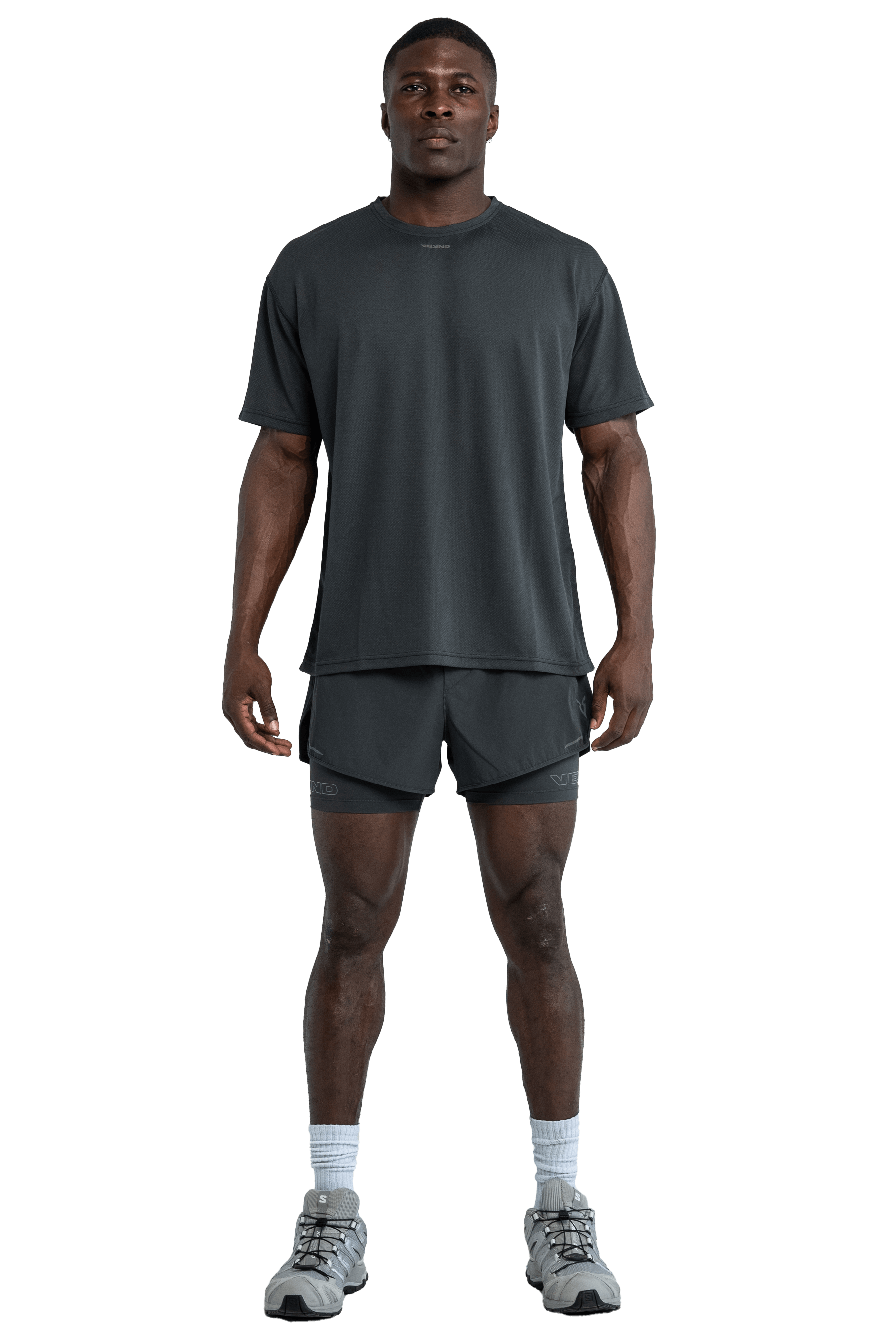 Dominate your workouts in this Signature Veynd dark gray t-shirt with edge. Created from our V_DRY fabric, it has chafe-free, quick-drying and anti-odor properties, keeping you cool and comfortable during the most intense sessions. The bold reflective graphic adds a touch of style while enhancing visibility no matter where you choose to workout.