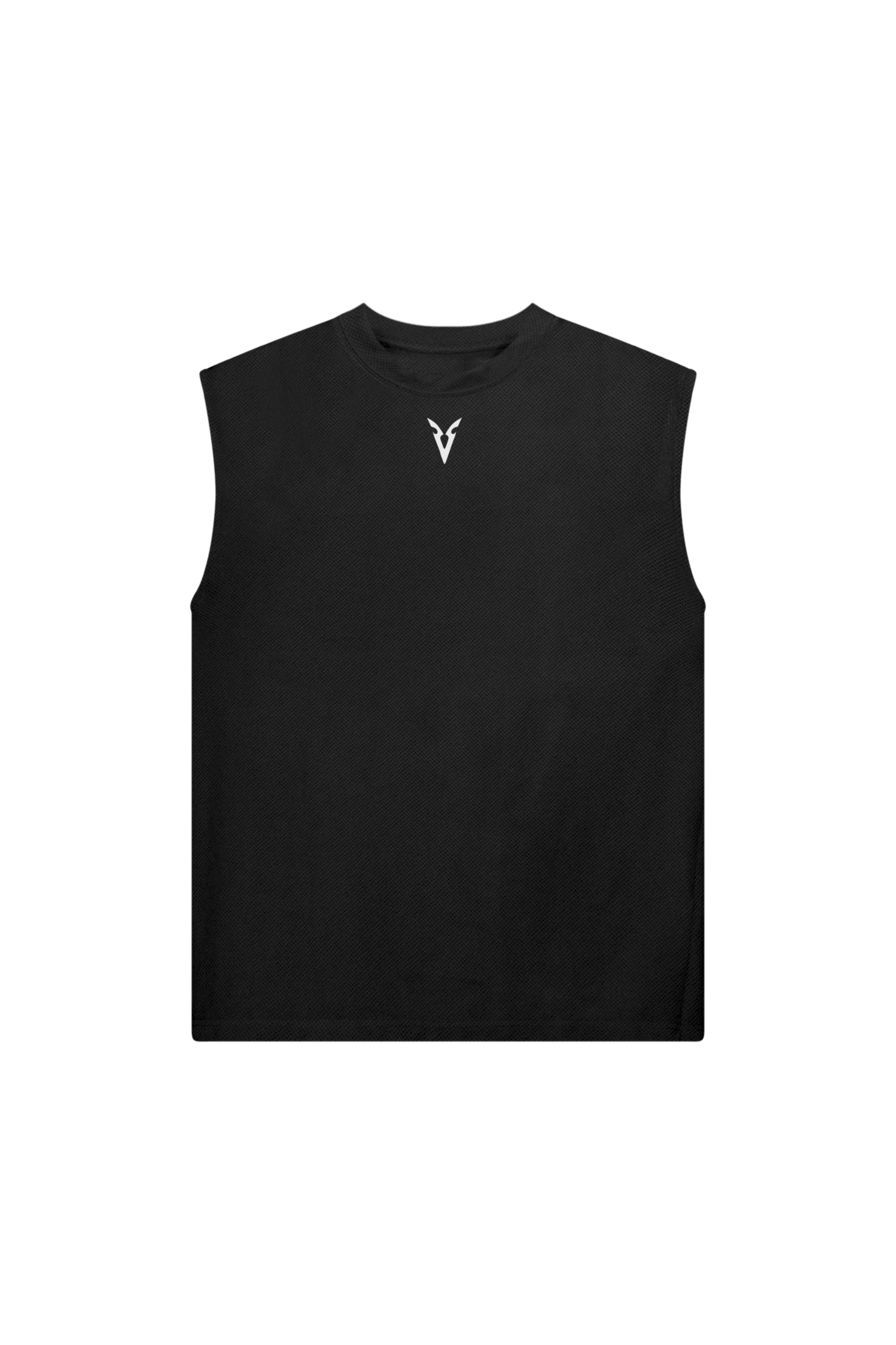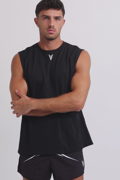 This performance-driven sleeveless t-shirt is made for any workout, no matter the intensity. Constructed with our signature V_DRY fabric, it wicks away moisture, drying quickly - keeping you cool and comfortable. The boxy fit, bold reflective graphic, and unique rough-cut aesthetic to the arms make it a standout piece.