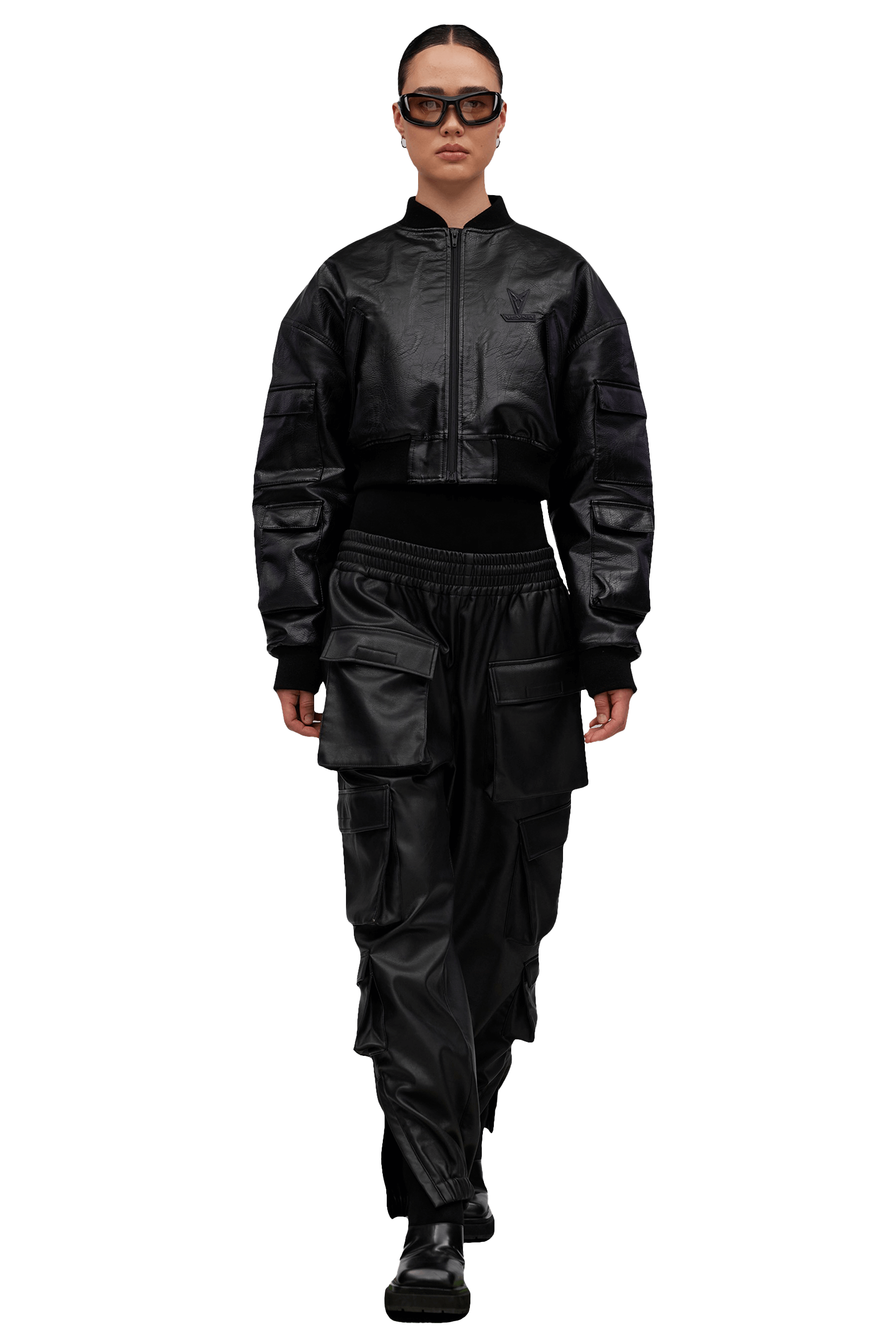 Our heavy faux V_GAN leather couture feel bomber for every day styling. Quilted interior for additional comfort and warmth while giving every ounce of style with our signature logos and oversized shaping.